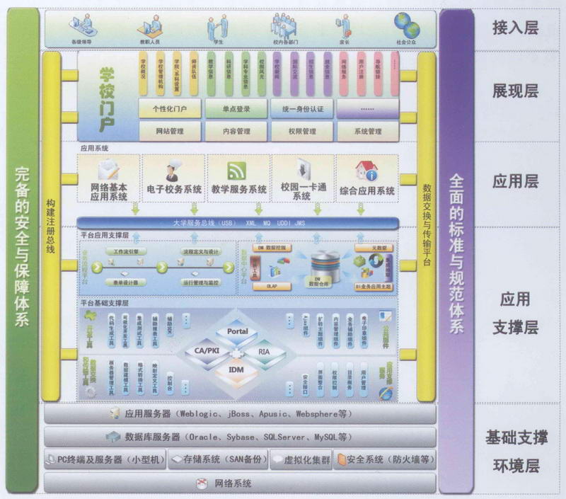 接入层接入层针对的用户包括各级领导、教职工、学生、家长、校内务部门和社会公众等。用户接入学校门户时需通过安全的身证认证(CA)及严格的权限授权。