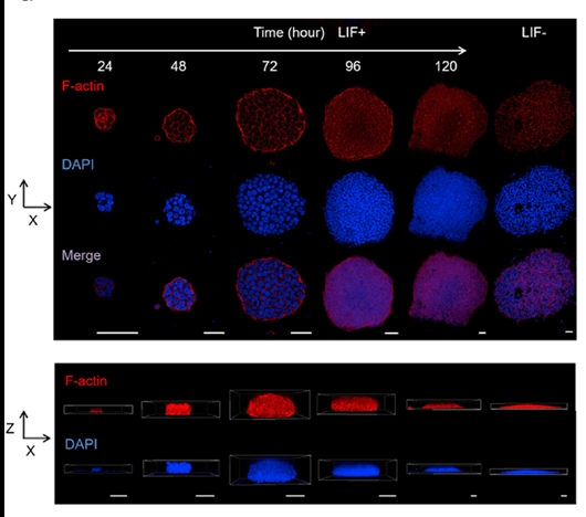 研究者进一步发现,小鼠胚胎干细胞集落内部压力可促进Nanog和Oct4两种基因的表达,而这种超细胞三维肌动球蛋白皮层对囊胚发育也有积极作用。
