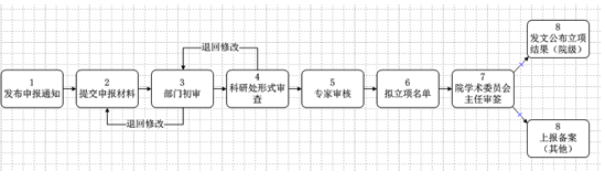 科研处收到课题申报文件→在全院范围内发布申报通知 →各二级学院(部)教学秘书提交纸质申报文件→科研处收集整理申报材料并对其进行形式审核合格则提交院学术委员会(不合格返回修改) → 院学术委员会聘请专家评审→院学术委员会主任审签→科研处根据评审结果择优上报并在科研处备案