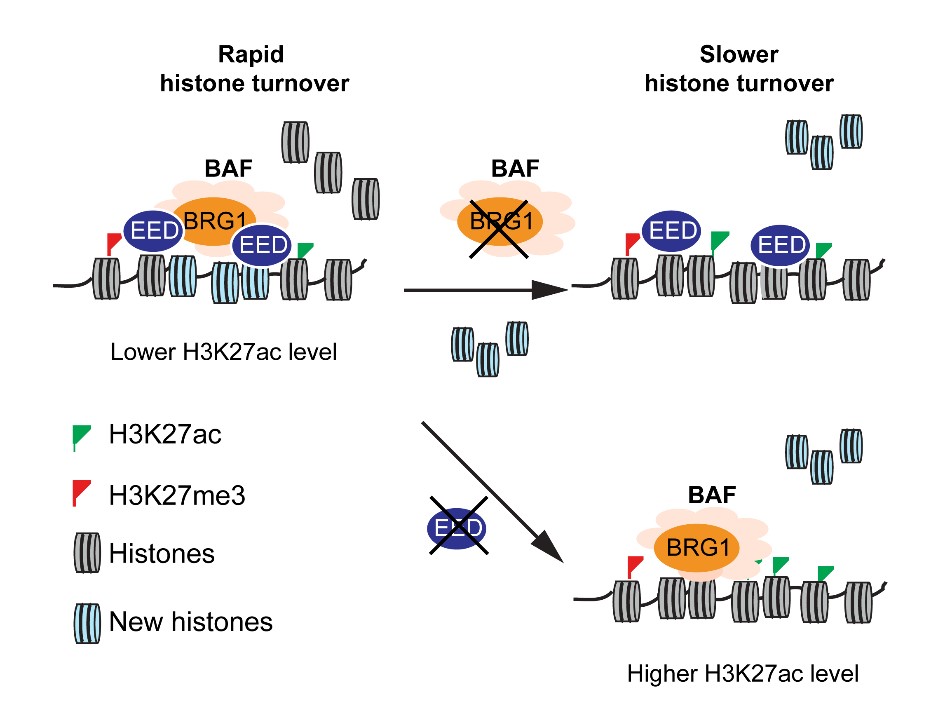 研究结果发现,心肌细胞中组蛋白快速更新区域富集了活跃转录的基因及顺式调控元件。他们进一步以增强子为研究对象,该研究阐明了染色质修饰因子EED可通过与染色质重塑因子BRG1相互作用,调节组蛋白更新速率,进而改变H3K27ac修饰水平,影响增强子活性。这项研究成果对于理解哺乳动物正常组织中表观遗传环境的维持及动态调控具有重要意义。北京大学分子医学研究所博士生李玉梅、艾珊珊及北大-清华生命科学联合中心博士生余先红为论文共同第一作者。何爱彬、李川昀为本文的通讯作者。这项研究获得科技部干细胞专项、国家自然科学基金委和北大-清华生命科学联合中心的支持。